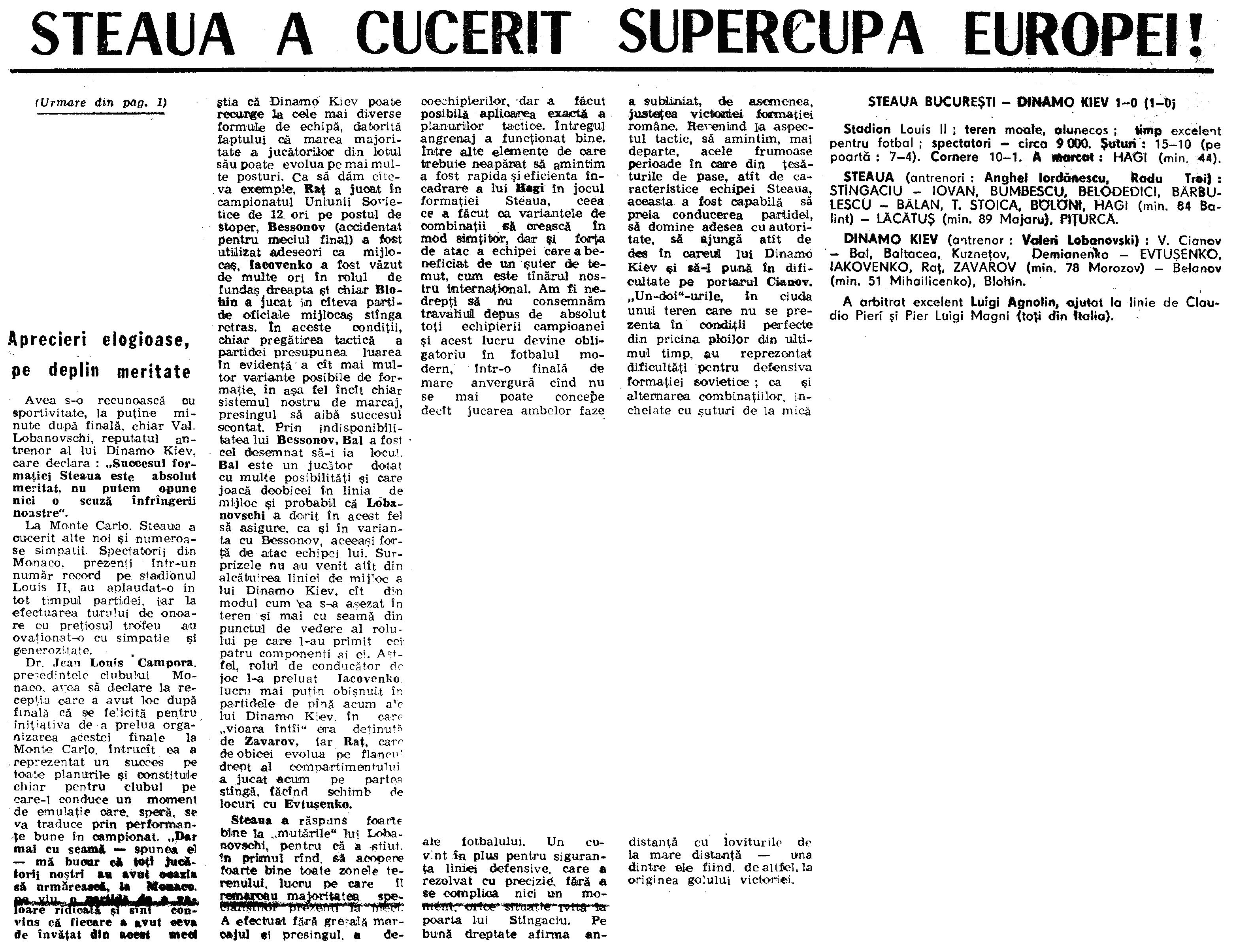 În 24 februarie 2018 se împlinesc 31 de ani de când o echipă românească de fotbal cucerea un ultim trofeu continental. La Monte Carlo, pe cochetul Stadion Louis II, Steaua București, în calitate de deținătoare a Cupei Campionilor Europeni, se duela, pentru Supercupa Europei, cu redutabila formație sovietică Dinamo Kiev, care intrase în posesia Cupei Cupelor.