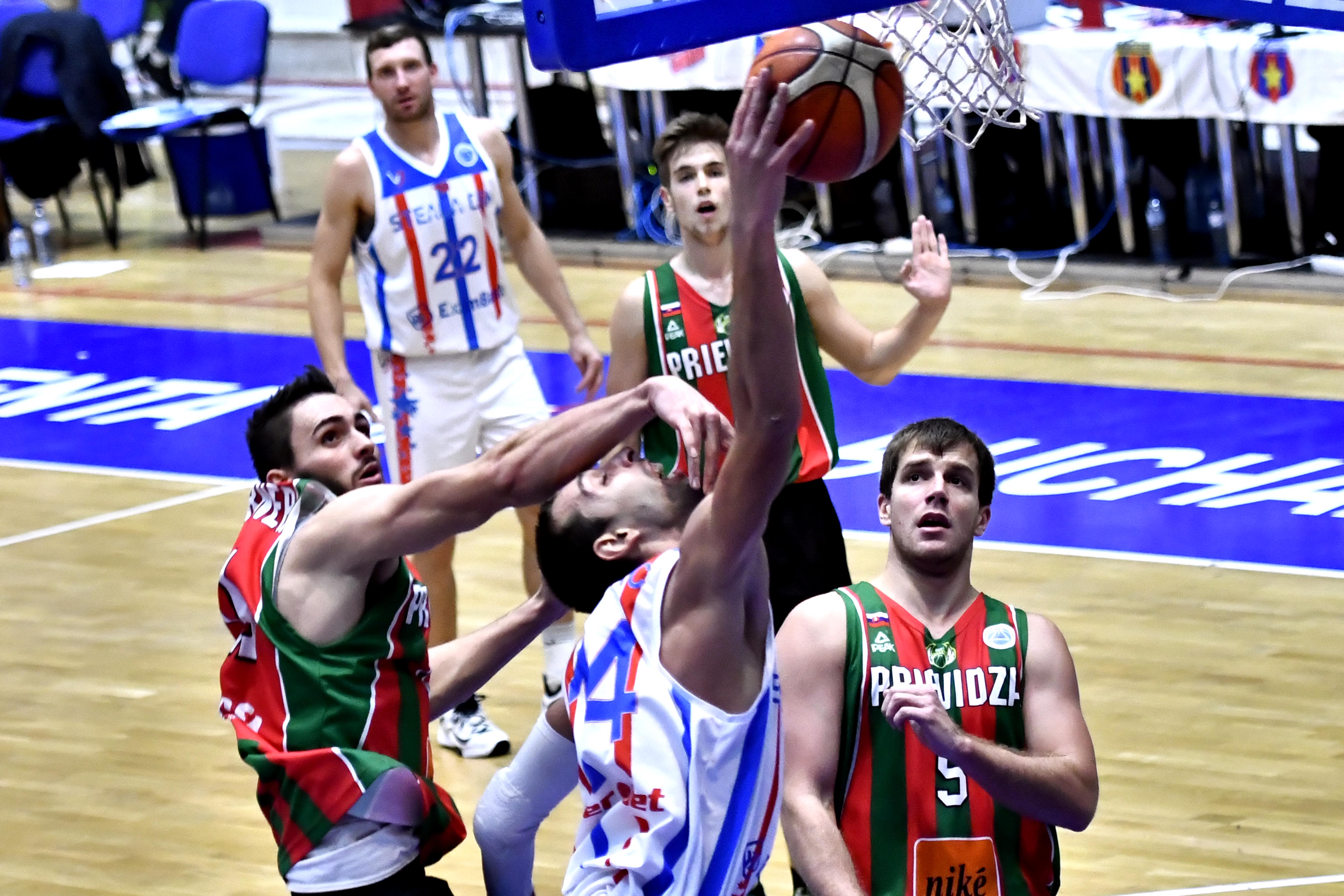 Partida găzduită de Sala Polivalentă „Ioan Kunst-Ghermănescu” a debutat sub semnul echilibrului, însă după zece minute de joc elevii lui Claudiu Fometescu s-au distanțat la șase puncte, 22-16. Pe fondul unor greșeli în ofensiva stelistă, slovacii au reușit să revină în joc, adjudecându-și al doilea și al treilea sfert cu 15-23, respectiv 21-22. Roș-albaștrii au făcut un adevărat spectacol baschetbalistic în ultimul sfert, câștigat cu 24-10, obținând o victorie categorică.