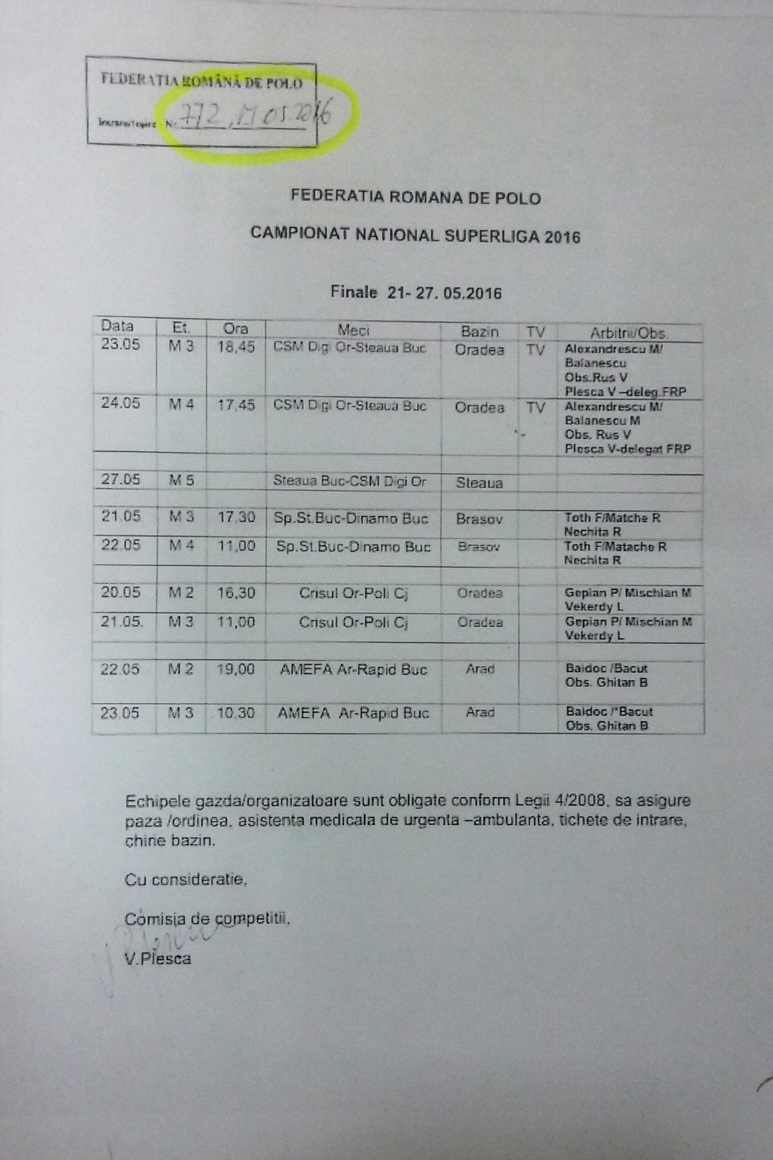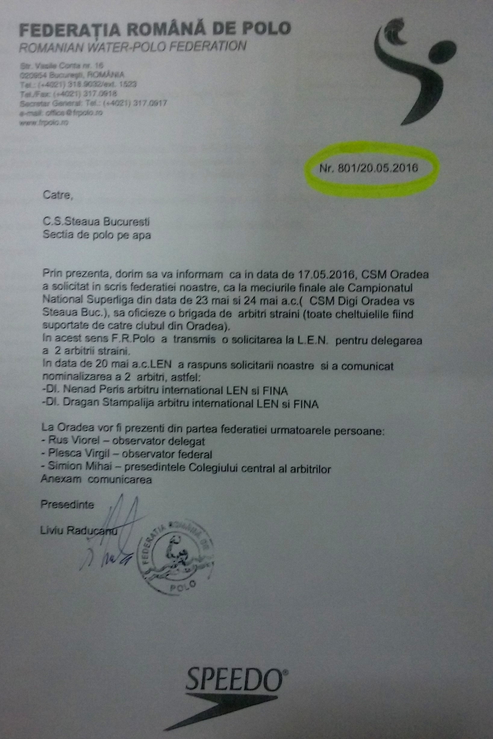 În acest context, după desfășurarea partidelor de la București, s-au luat măsuri pe linie de organizare a următoarelor două meciuri, în cadrul Biroului Federal al Federației Române de Polo, în data de 17 mai 2016. În urma discuțiilor, au fost delegați arbitrii partidelor de la Oradea (Mihnea Alexandrescu, Mihai Bălănescu), iar Clubul Sportiv al Armatei ”Steaua București” a primit adresa înregistrată la Federația Română de Polo cu nr.772/17.05.2017 (foto 1).