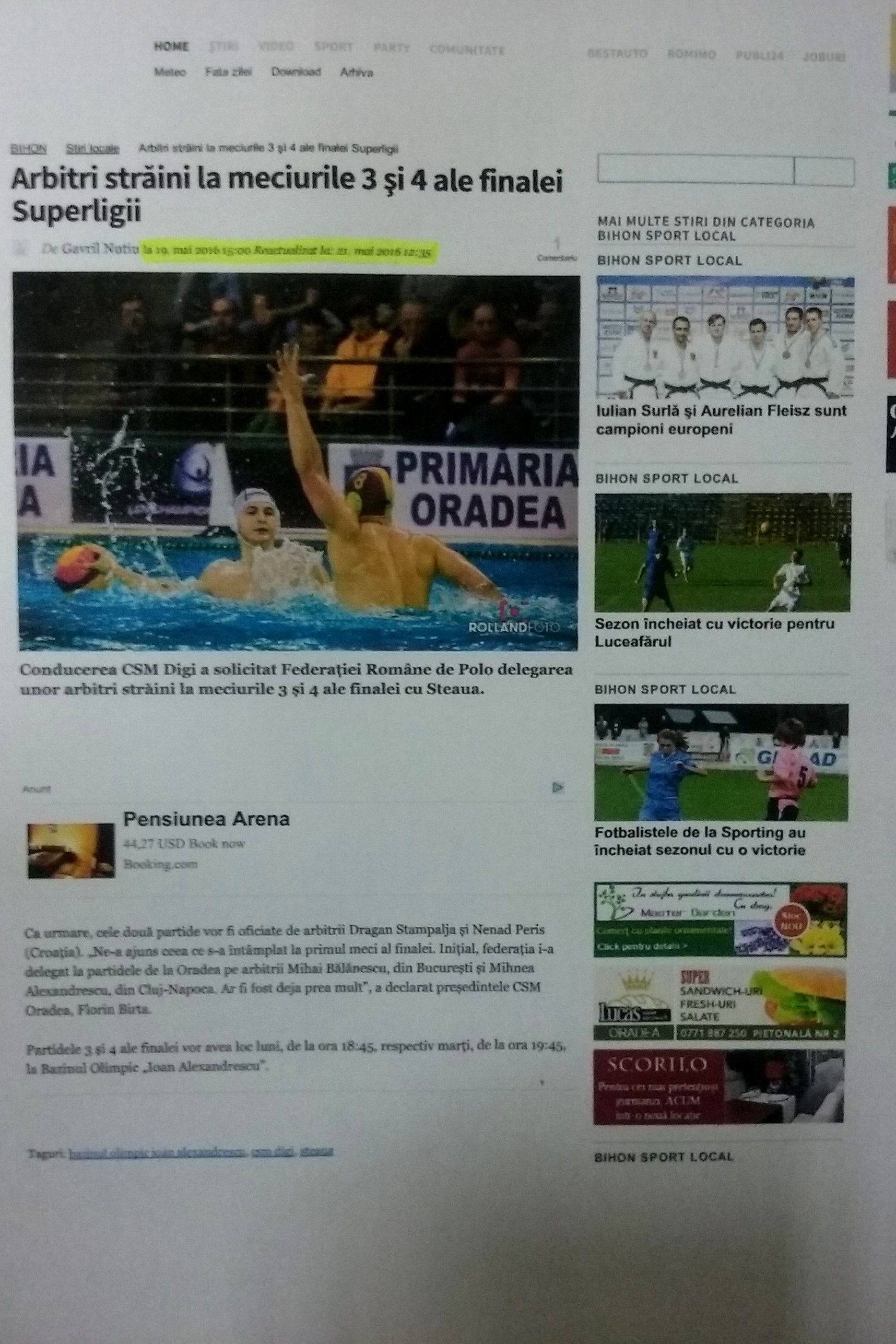 După două zile, pe 19.05.2016, conducerea CSM DIGI Oradea a anunțat că a solicitat arbitri străini la meciurile 3 și 4. Informația a apărut într-o publicație online – foto 2(http://www.bihon.ro/arbitri-straini-la-meciurile-3-si-4-ale-finalei-superligii/1645476), iar Federația Română de Polo a informat Clubul Sportiv al Armatei ”Steaua București” despre această schimbare abia după încă o zi, pe 20.05.2016 (foto 3).
