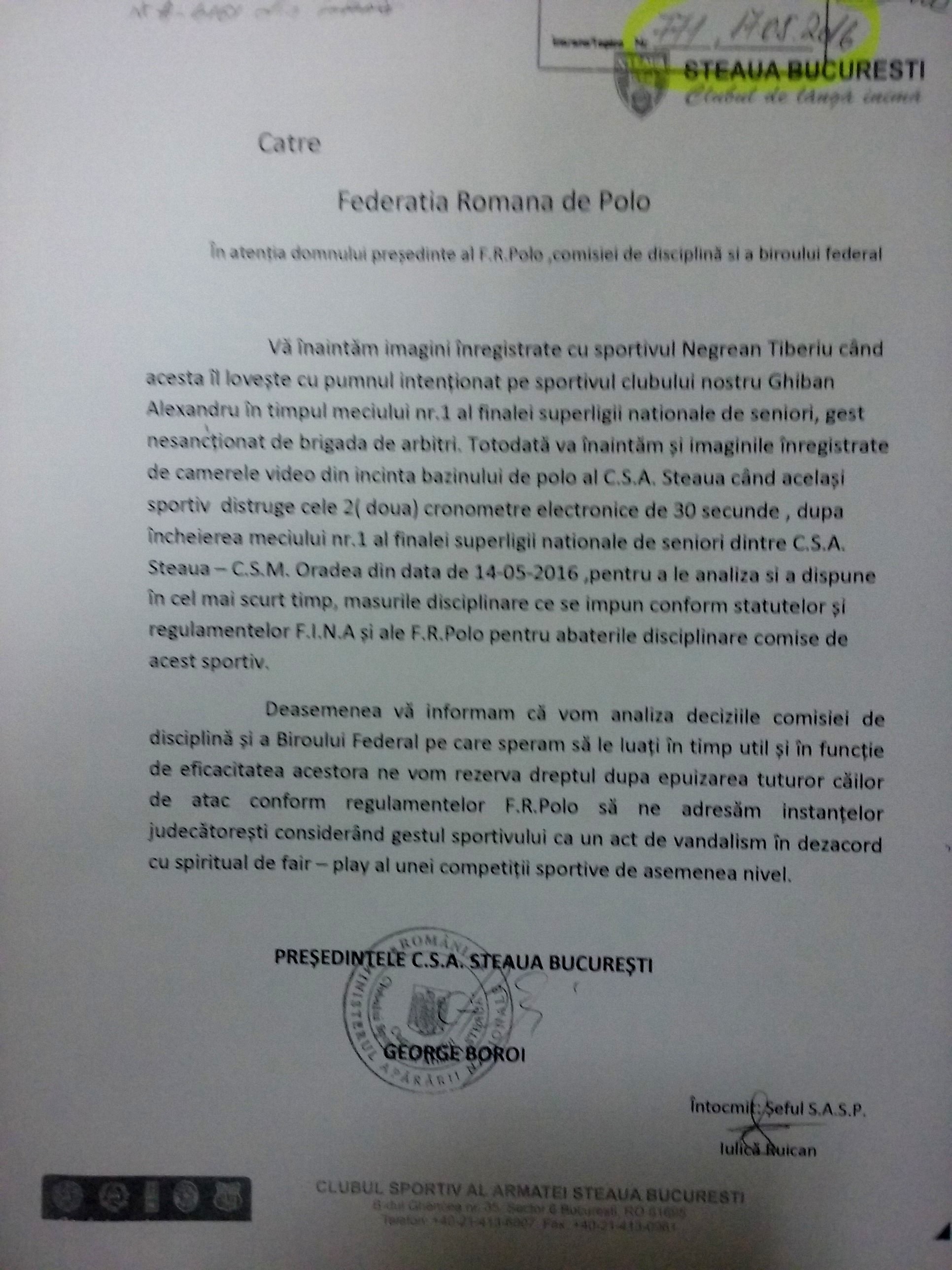 Clubul Sportiv al Armatei ”Steaua București” dorește să aducă la cunoștința opiniei publice neregulile semnalate în ultima perioadă în desfășurarea ultimului act al Superligii Naționale de Polo. Toate aceste nereguli au fost deja aduse la cunoștința factorilor de decizie din cadrul Federației Române de Polo pe apă.