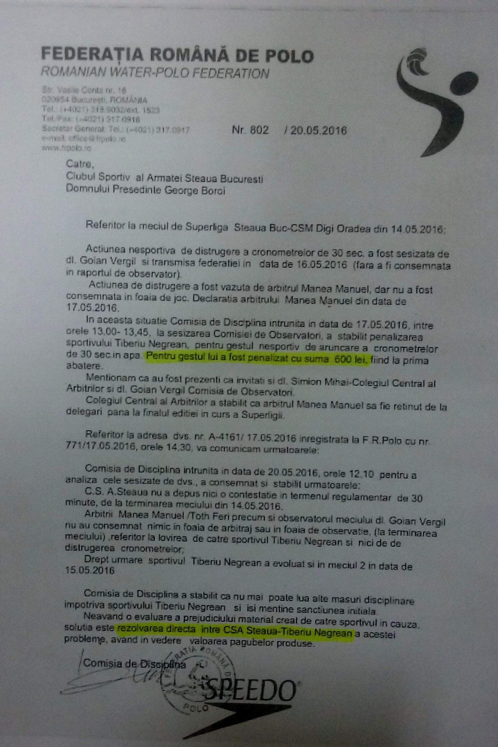 Comisia de Disciplină întrunită în data de 20 mai a decis să nu îl sancționeze pe Tiberiu Negrean pentru lovirea jucătorului stelist, chiar dacă oficialii CSA ”Steaua București” au înaintat și o probă video în acest sens, iar pentru faptul că a aruncat cronometrele de 30 de secunde în apă a fost penalizat cu suma de 600 de lei, sugerând ca, în situația în care prejudiciul este mai mare, situația să se rezolve direct între CSA ”Steaua București” și Tiberiu Negrean (foto 5). Conform Regulamentului Comisiei de Disciplină, art 51 (pag.94), imaginile video sunt acceptate ca probă.