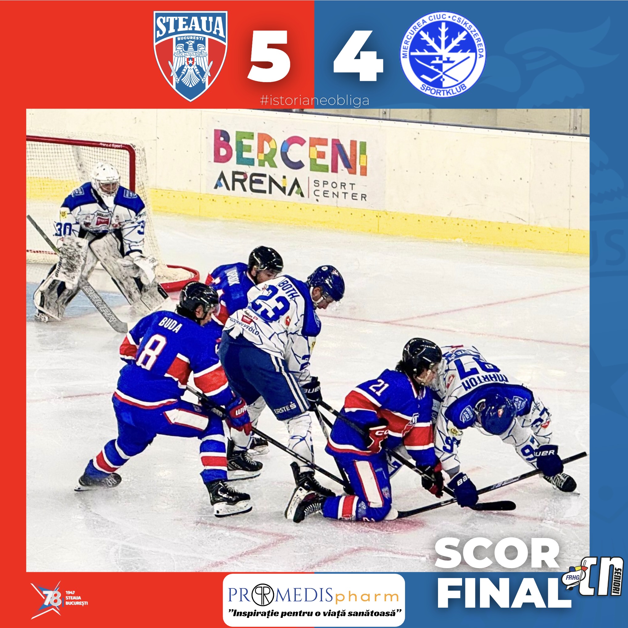 În primul derby al sezonului, Steaua se impune în fața eternei rivale, SC Miercurea Ciuc, după un meci spectaculos și intens, jucat până în ultima secundă. Băieții noștri au jucat fantastic. Oaspeții au condus cu 2-1 după prima repriză, dar Steaua a câștigat următoarele două părți ale partidei.