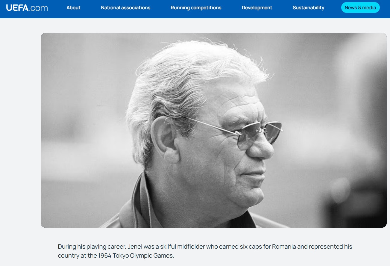 ”Comunitatea de fotbal din România îl deplânge pe Emerich Jenei, antrenor câștigător al Cupei Campionilor Europeni, care s-a stins din viață la vârsta de 88 de ani. În timpul carierei sale de jucător, Jenei a fost un mijlocaș tehnic, care a adunat șase selecții pentru echipa națională a României, reprezentându-și țara la Jocurile Olimpice din 1964 de la Tokyo.