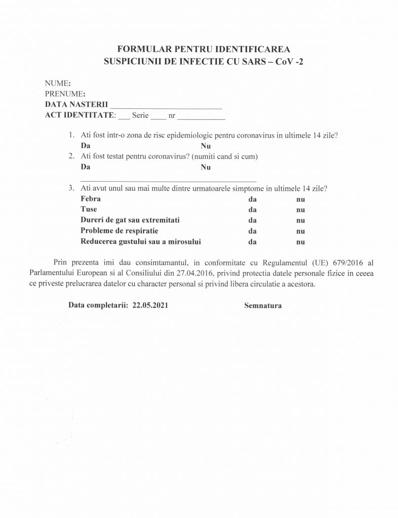Pentru evitarea aglomerației la punctul de acces, avem rugămintea să veniți cu documentul atașat din acest comunicat, deja completat.