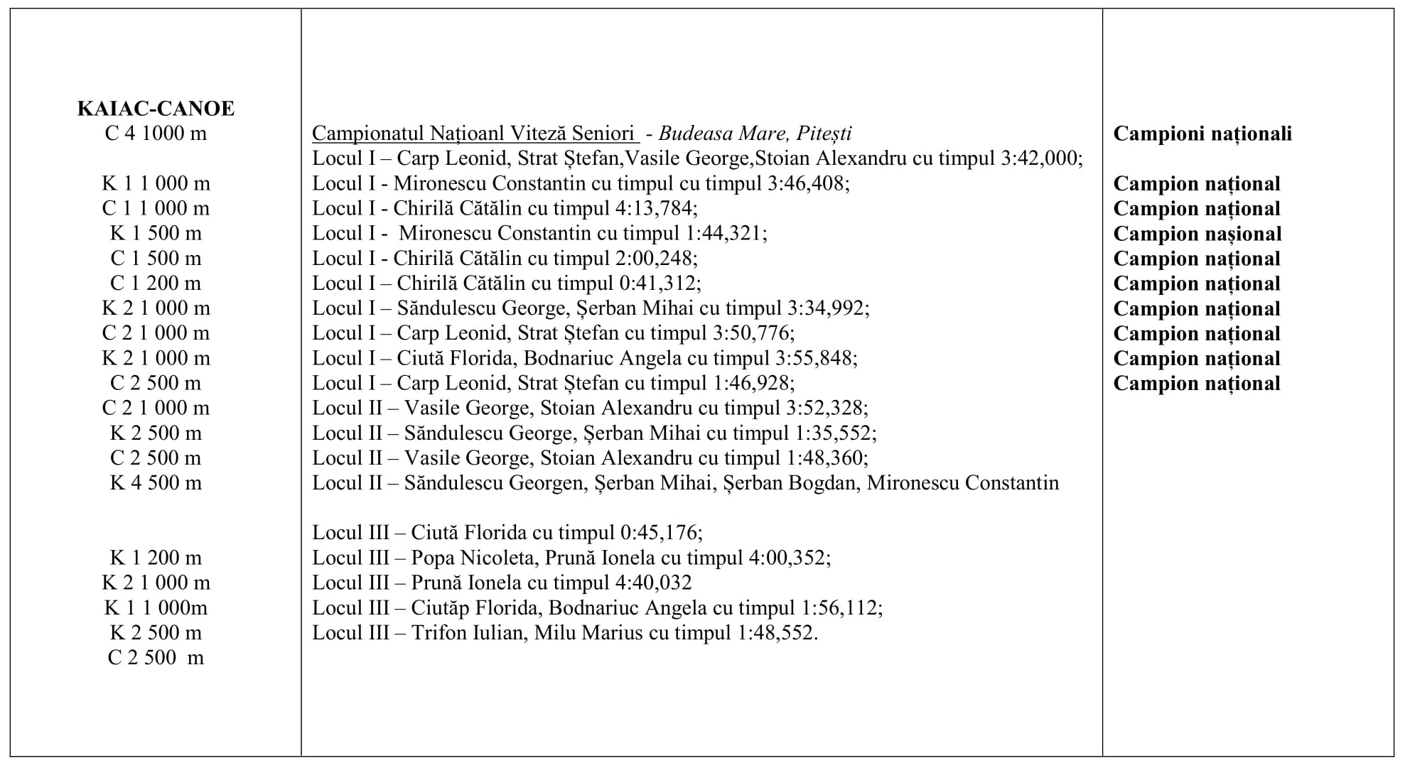 Rezultatele obținute de kaiac-iștii steliști sunt următoarele.