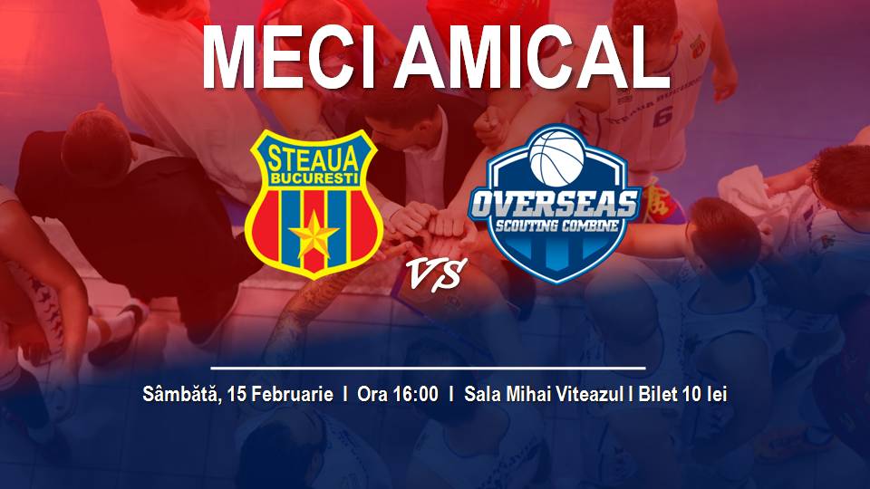 Echipa de baschet Steaua București va profita de pauza competițională și revine în fața propriilor suporteri într-un meci de pregătire cu selecționata de jucători americani liberi de contract – Overseas Scouting Combine. Partida este programată pentru 15 februarie, ora 16.00, la Sala Mihai Viteazul.
