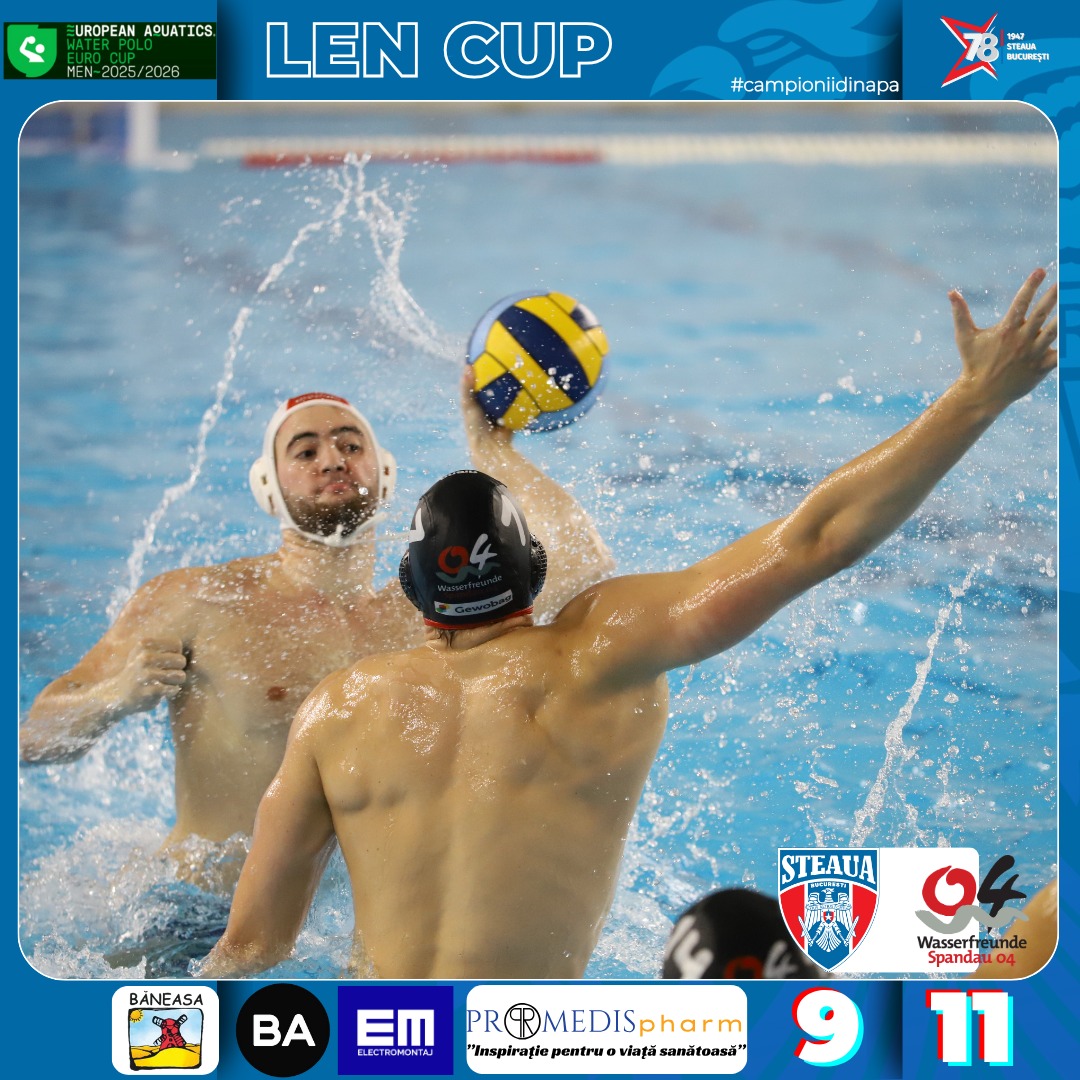 Steaua București pierde al doilea meci în grupa D din LEN Euro Cup. Ca și în primul joc, din Serbia, cu VK Sabac, echipa noastră cedează cu același scor: 9-11, de această dată în fața vicecampioanei Germaniei, Spandau 04 Berlin.