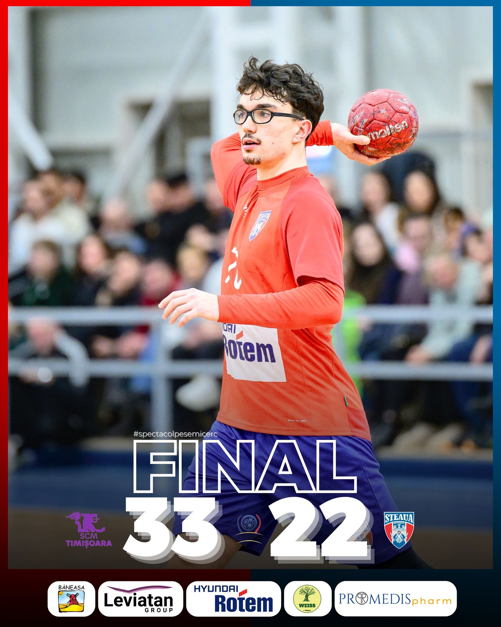 Steaua a întâlnit în semifinale echipa gazdă SCM Politehnica Timișoara. Roș-albaștrii au jucat foarte bine timp de aproximativ 40 de minute. După 13-14 la pauză, ocupanta locului 2 în Liga Zimbrilor s-a desprins decisiv. Portarii bănățenilor au făcut diferența. Antrenorul Ionuț Georgescu a rulat tot lotul de jucători, iar tabela a arătat la final un scor destul de drastic: 22-33.
