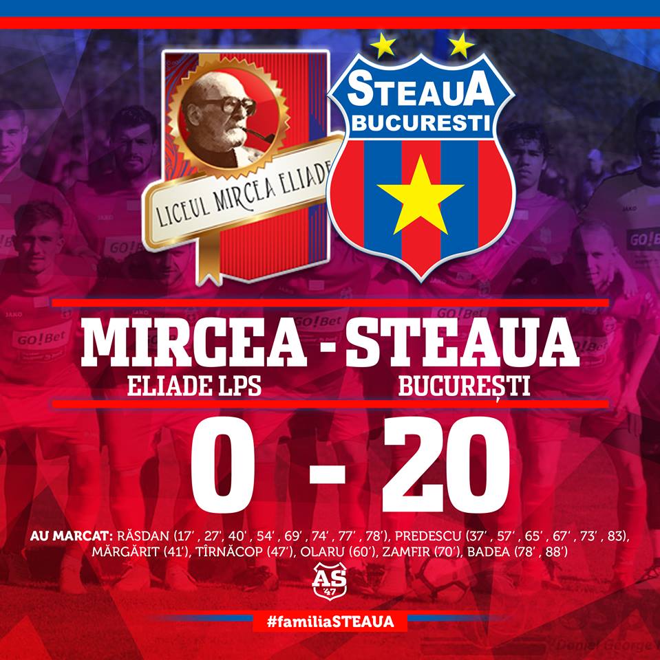 Echipa de fotbal Steaua București s-a impus cu scorul de 20-0 (5-0) în fața celor de la LPS Mircea Eliade, într-un meci contând pentru Liga a IV-a, care s-a disputat pe Stadionul Progresul Spartac, fără spectatori.