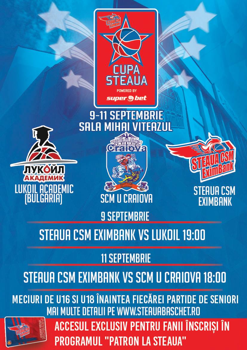 În perioada 9-11 septembrie, Steaua CSM EximBank organizează „Cupa Steaua powered by Superbet”, un turneu la care vor participa, alături de echipa noastră, PBC Lukoil Academic și SCM U Craiova.